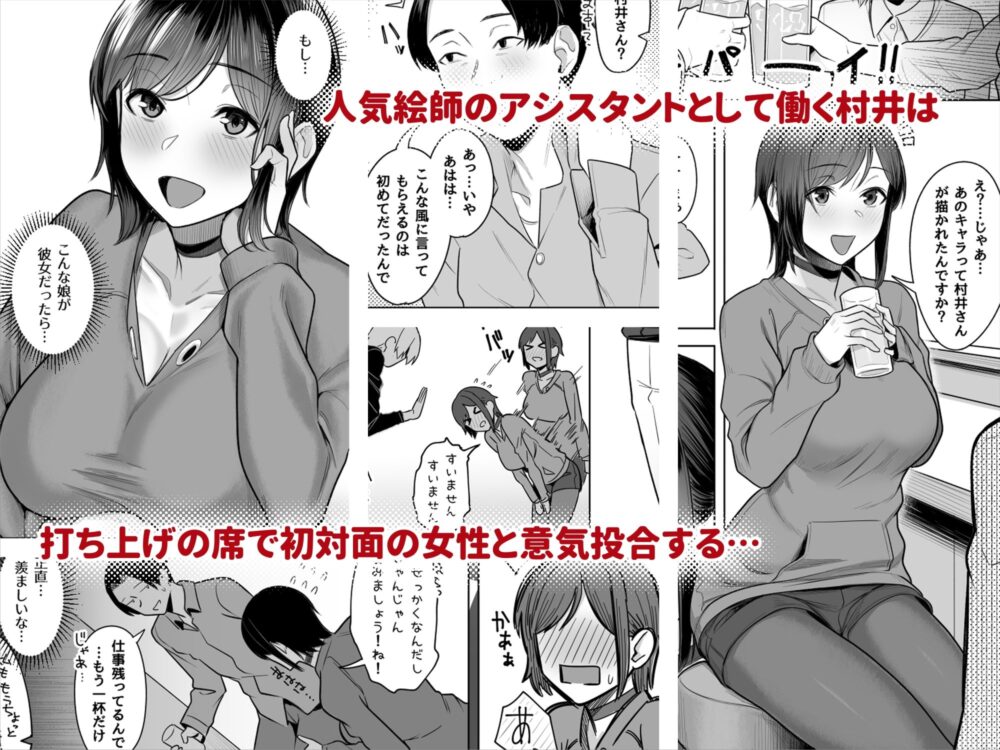 物語は、村井ってイラストレーターのアシスタントが主人公なんだ。彼は同人イベントの打ち上げで、自分の描いたキャラクターのファンだという女性に出会う。初対面なのに、すぐに意気投合して仲良くなっちゃうんだよね。