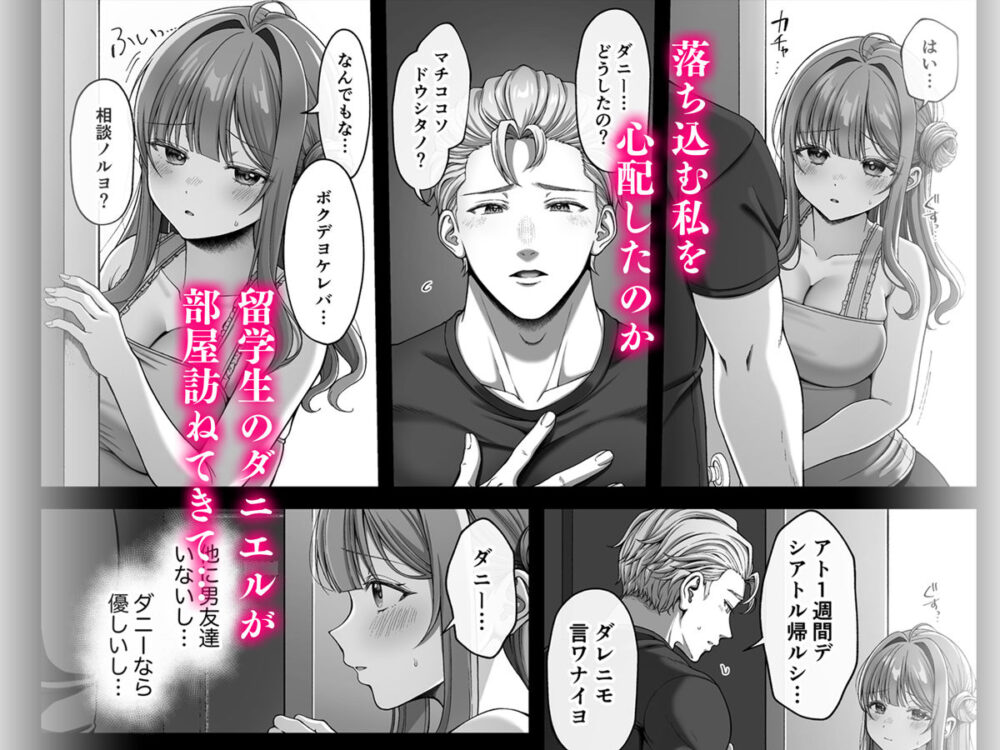真千子は落ち込んでしまいましたが、その時、ホームステイ中の外国人であるダニエルが彼女の部屋を訪ねてきました。彼はリラックス効果のあるアロマを嗅がせてくれましたが、実はそれは催淫効果のある媚薬だったのです。真千子は朦朧としている間に、ダニエルに処女を奪われてしまいました。